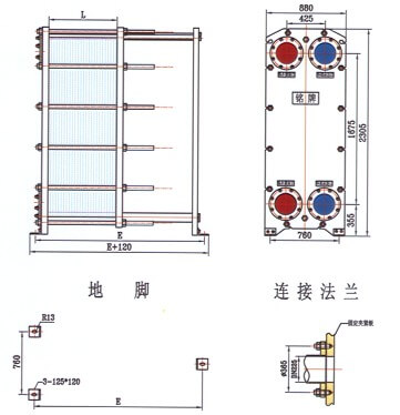 框架包括一個固定壓緊板和一個活動壓緊板,由上導桿與下導桿支承,在另‘端有一支柱。壓制成的波紋板片懸掛在兩板之間的上導桿上,移動活動壓緊板將板片組壓緊,再用一組夾緊螺柱將固定壓緊板和活動壓緊板夾緊至一定尺寸。兩種介質經(jīng)固定(或活動)壓緊板上法蘭孔流入由波紋板片組成的各自通道,熱交換后介質再由固定(或活動)壓緊板上的法蘭孔流出。同定壓緊板、活動壓緊板、支柱及導桿均為低碳鋼??紤]到用戶的多種使用要求,框架設計有多種型式,主要有雙支撐框架式和常用的落地式等,也可根據(jù)用戶的要求更改框架的型式。
