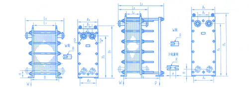 | 換熱面積 | 板片數 | L1 | l2 | l3 | A1 | A2 | A3 | H1 | H2 | H3 | B1 | B2 | R | a | D | DN | 工作壓力 MPA | 質量 Kg |